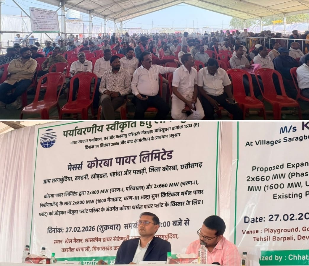 कोरबा (कोरबा वाणी)- पर्यावरण संरक्षण मण्डल द्वारा जिले के बरपाली तहसील अंतर्गत कोरबा पॉवर लिमिटेड (केपील),पताड़ी के प्रस्तावित 1600 मेगावाट के क्षमता विस्तार के लिए शुक्रवार को आयोजित जनसुनवाई सफलता पूर्वक सम्पन्न हो गई। कलेक्टर कोरबा द्वारा छत्तीसगढ़ पर्यावरण संरक्षण मण्डल के पर्यावरण स्वीकृति के आदेश के लिए जनसुनवाई 27 फरवरी 2026 को दोपहर 12 बजे से ग्राम सरगबूंदिया स्थित शासकीय स्कूल के खेल मैदान में आयोजित की गई। जिसमें पीठासीन अधिकारी के रूप में कोरबा के अतिरिक्त कलेक्टर देवेन्द्र पटेल, छत्तीसगढ़ पर्यावरण संरक्षण मण्डल, कोरबा के क्षेत्रीय अधिकारी अंकुर साहू मौजूद थे। इसके साथ ही एसडीएम सरोज कुमार महिलांगे, कार्यपालक अभियंता प्रसन्ना सोनकर सहित अन्य प्रशासनिक अधिकारी उपस्थित थे। अदाणी पॉवर लिमिटेड से पर्यावरण विभाग प्रमुख आर एन शुक्ला ने केपील परियोजना के बारे में विस्तार से जानकारी दी। जनसुनवाई लगभग 2.30 घंटे तक चली। जिसमें बरपाली तहसील के ग्राम खोड्डल, पताड़ी, सरगबूंदिया,पहंदा, बरीडीह, तिलकेजा सहित कुल 12 गांव के हजारों ग्रामीणों ने भाग लिया। इस दौरान सभा में ग्रामीणों द्वारा मुख्यरूप से क्षेत्र के विकास, नौकरी और स्वरोजगार के लिए उचित प्रबंध सहित कई मांगों तथा दिए सुझावों को पीठासीन अधिकारी ने बड़े ही ध्यानपूर्वक सुनकर कंपनी के अधिकारियों की उपस्थिति में संबंधित मांगों पर विचार करने का भरोसा दिलाया।